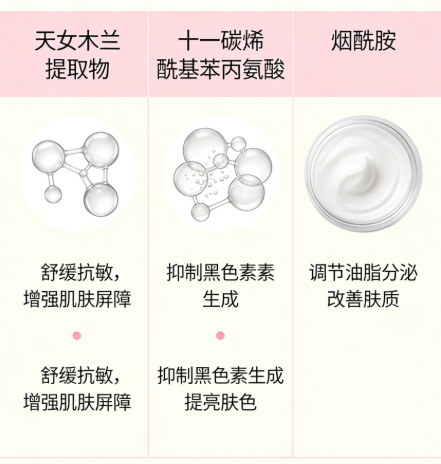 三重通路抑制黑色素。天女木兰提取物抑制酪氨酸酶活性(IC50 12.5μg/mL,抑制率89.3%),5%烟酰胺阻断黑色素小体转运,十一碳烯酰基苯丙氨酸拮抗α-MSH信号。三方协同覆盖黑色素生成全链条。