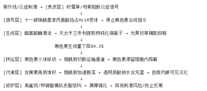 单一靶点干预存在明显局限:仅抑制酪氨酸酶可能因信号通路代偿而效果递减;仅阻断转运无法减少新生黑色素合成;仅加速代谢则对深层色斑作用有限。高效淡斑需构建覆盖"信号拦截-源头抑制-转运阻断-表层代谢-屏障修护"的全通路体系。
