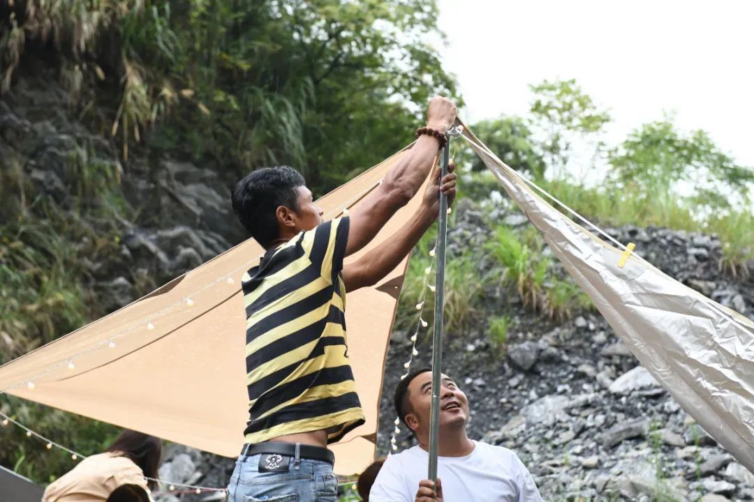 (村民冒雨帮助加固影展天幕)