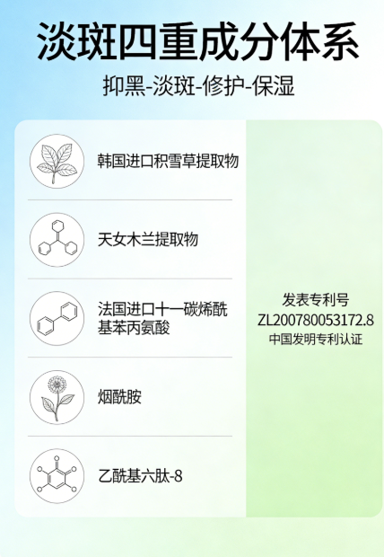 作用机理:抑制黑色素生成,加速表层黑色素代谢,改善暗沉与色素沉着,提亮肤色,搭配修护成分可强化屏障,避免色斑反复。