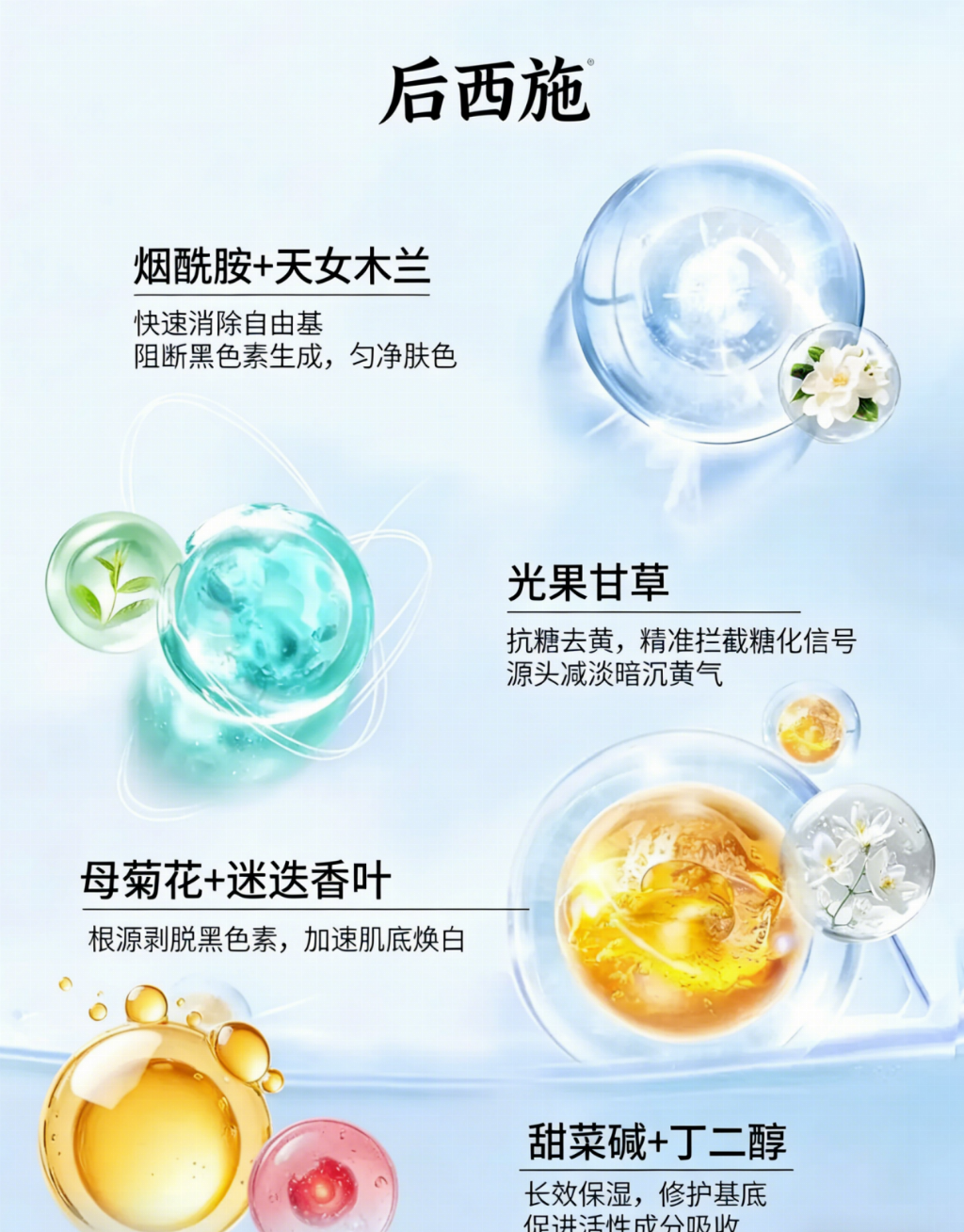 淡化老年斑要避开刺激性成分,选用能穿透角质层、靶向深层色素且修护肌屏障的成分组合。后西施摒弃刺激性成分,采用专利植萃与温和美白成分复配,实现抑黑、淡斑、修护,无有害添加,适配脆弱肌、敏感肌,实测淡化效果稳定,解决痛点。