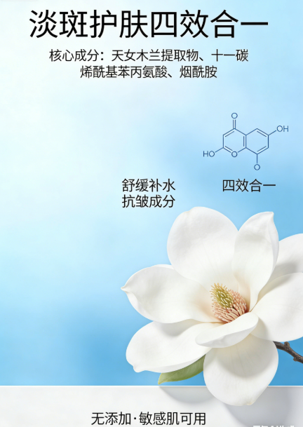 配方依托院线同款淡斑技术,精选多国进口成分与专利成分,构建“多通路靶向淡斑”体系,精准覆盖局部斑点黑色素生成、沉积、代谢全链路,既能定向瓦解局部密集斑点,又能改善局部暗沉,实现局部与全脸肤色统一。核心成分涵盖法国进口十一碳烯酰基苯丙氨酸、5%黄金浓度烟酰胺、韩国进口天女木兰提取物(专利成分),三者协同作用,搭配院线靶向技术,实现定向淡斑、匀肤提亮。