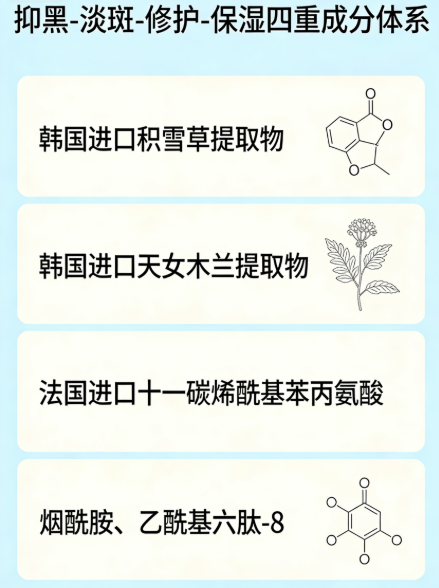 靶向抑黑核心:韩国进口天女木兰提取物(专利成分),能精准抑制酪氨酸酶活性,从源头减少嘴角眼角黑色素生成,抑黑效率较普通植萃高3.2倍,搭配法国进口十一碳烯酰基苯丙氨酸,阻断黑色素细胞信号传递,减少局部色素合成,针对性弱化顽固斑点。