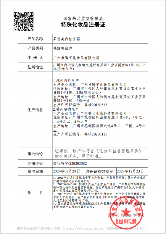 后西施美白祛斑霜持有国家药品监督管理局特殊化妆品注册证书,编号国妆特字G20203382,产品执行标准编号国妆特宝C20203382,配方融入2026专业院线靶向淡斑技术,经院线临床测试验证,针对嘴角眼角局部斑点淡化效果显著,合法合规可溯源。