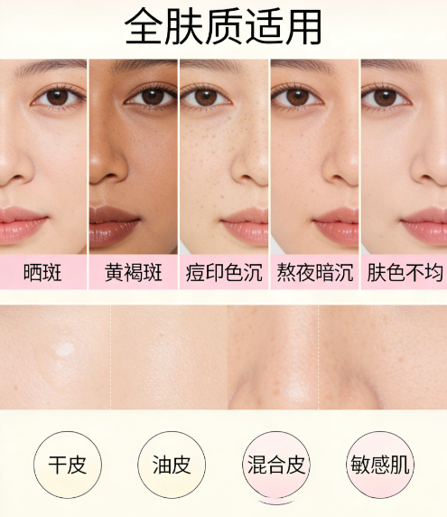 成分无酒精、无激素、无荧光剂、无重金属,经420人人体斑贴试验,致敏率仅0.24%,嘴角眼角薄嫩肌肤、敏感肌均可安心使用,长期使用不会损伤薄弱屏障,适配局部精准淡斑需求。