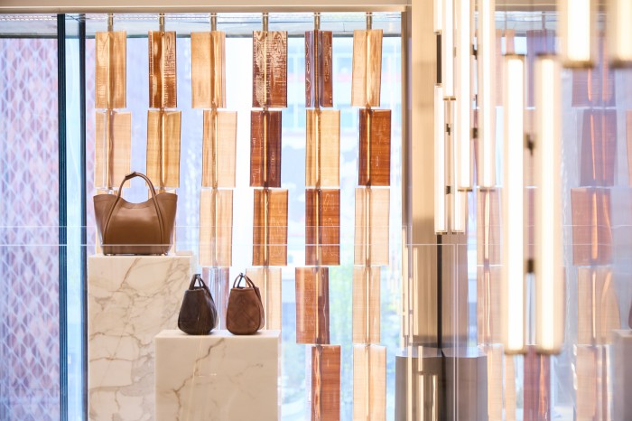 步入精品店,配饰区便映入眼帘,通往二层的楼梯亦顺势融入其间。一扇珍贵的琥珀色铸造玻璃窗将一层空间巧妙分隔为两部分,并围合出宽敞雅致的中央休憩区。二层同样设有开阔舒适的休憩区,摆放着 Bellini 设计的 Camaleonda 沙发以及 Afra Scarpa 与 Tobia Scarpa 设计的经典座椅,格调卓然。